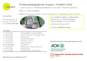 TIME-AUT® – Gesund leben mit Autismus – dazu gehört, aus unserer Sicht, ganz besonders die stärkere soziale Einbindung von Autist/-innen. Wir konzentrieren uns dabei auf die sensible Übergangsphase von der Schule, der Ausbildung oder dem Studium in ein selbstständigeres Erwachsenenleben. Wir bieten deshalb passgenaue, erlebnispädagogische Gruppenangebote für jugendliche und junge erwachsene Autist/-innen mit geringem Unterstützungsbedarf in Freiburg und Umgebung an.